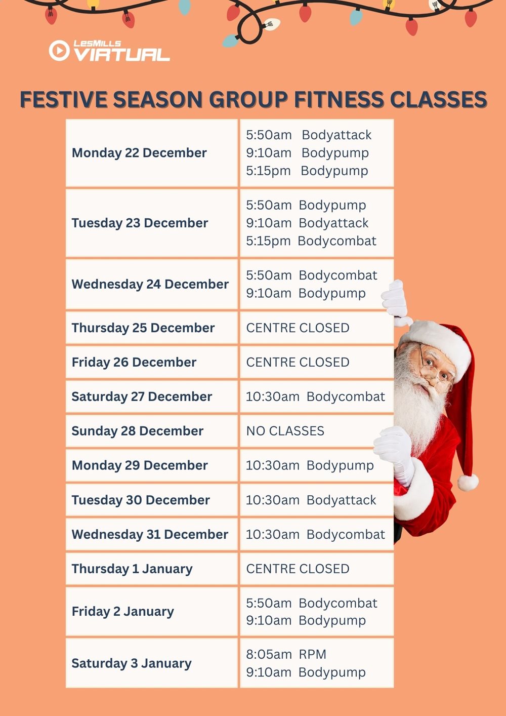 While our live Group Fitness classes pause briefly over the festive period, you can keep moving with our scheduled virtual classes running from Monday 22 December to Saturday 3 January.